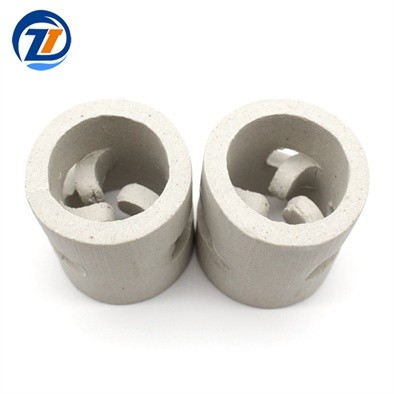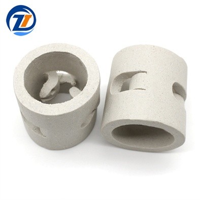 陶瓷鮑爾環(huán)填料是在陶瓷拉西環(huán)的基礎(chǔ)上開發(fā)的一種高徑相等的開孔環(huán)型填料, 每層窗孔有 5個(gè)舌葉, 每個(gè)舌葉內(nèi)彎指向環(huán)心,上下兩層窗孔的位置相反錯(cuò)開,一般開孔面積約占環(huán)壁總面積的 30% 左右,使得填料塔內(nèi)的氣體和液體能夠從窗孔自由通過,改善了氣液分布充分利用了環(huán)的內(nèi)表面。