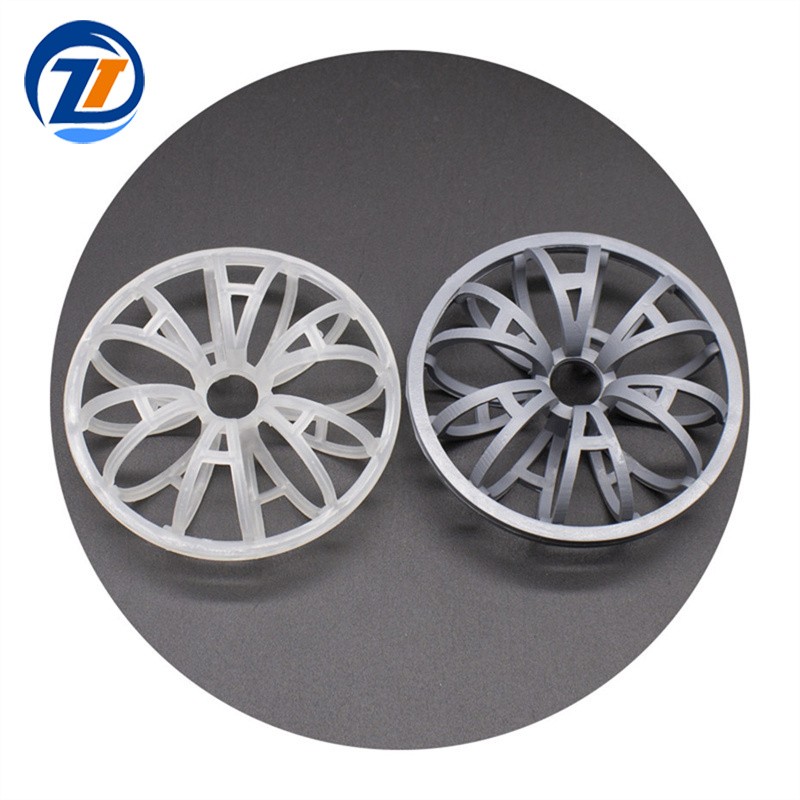 PP花環(huán)填料又稱泰勒花環(huán),是由12個小圓環(huán)按徑向排列而組成的一個大扁環(huán)體,很類似于一個螺旋形彈簧首尾相接繞成的一個圓球體。這種填料的主要特點是填料的空隙率大,不易被堵塞,還有通量大、阻力小等優(yōu)點,由于這種填料的間隙處能有較高的滯液量,可使塔內(nèi)液體停留時間較長,從而增加了氣液的接觸時間,提高了優(yōu)質(zhì)效率。