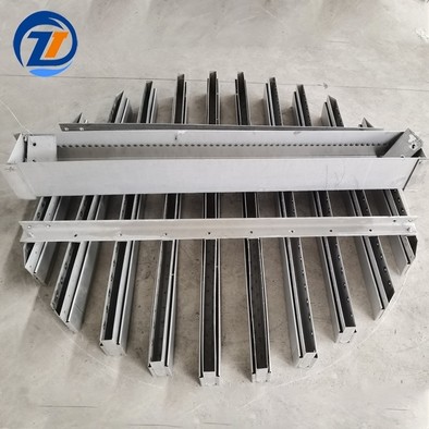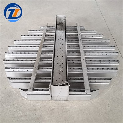 金屬槽盤式液體分布器:是獲獎專利產(chǎn)品,是盤式液體分布器的新進展。之所以稱其為槽盤氣液分布器是因為它是若干個分布槽規(guī)排序后組焊而成的盤式分布器,起到了集液、布液、布氣和側(cè)線采出作用,故取名“槽盤式氣液分布器”。
