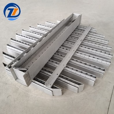 槽式液體分布器為重力型液體分布器,一般由一級槽(主曹)和二級槽(分槽),兩級槽及槽型梁組成一級槽至于二級槽之上。液體通過進料管進入主槽。再由主槽按比例分配到分槽中。該液體分布器淋降點密度較大。氣流通道均勻,自由截面積大,氣體壓降小,該分布器占用的空間比較大,尤其是在做液體在分布器時,由于其自身無液體收集作用,因此還需在其上加一個液體收集器。這種分布器適用于塔徑較大的填料塔中。一般大于DN800mm。