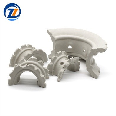 異鞍環(huán)陶瓷填料是在矩鞍環(huán)填料的基礎(chǔ)上加以改進(jìn)的新型填料,將矩鞍填料的平滑弧形側(cè)面改為鋸齒形或紋紋凸起的側(cè)面。這樣在填料床層內(nèi),增加了填料間接觸的空隙,使之更有利于氣體和液體在填料層中的流動(dòng)和分散,具有壓降低,傳質(zhì)效率高等特點(diǎn),廣泛應(yīng)用于硫酸生產(chǎn)的干燥塔和吸收塔中。