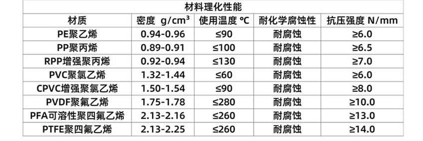 塑料材質(zhì)包括:PP聚丙烯、RPP增強聚丙烯、CPVC增強聚氯乙烯、PTFE聚四氟乙烯、PE聚乙烯、PVC聚氯乙烯、PVDF聚氟乙烯、PTFE聚四氟乙烯。
