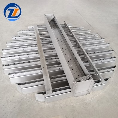 槽式液體分布器為重力型液體分布器,一般由一級(jí)槽(主曹)和二級(jí)槽(分槽),兩級(jí)槽及槽型梁組成一級(jí)槽至于二級(jí)槽之上。液體通過進(jìn)料管進(jìn)入主槽。再由主槽按比例分配到分槽中。該液體分布器淋降點(diǎn)密度較大。氣流通道均勻,自由截面積大,氣體壓降小,該分布器占用的空間比較大,尤其是在做液體在分布器時(shí),由于其自身無液體收集作用,因此還需在其上加一個(gè)液體收集器。這種分布器適用于塔徑較大的填料塔中。一般大于DN800mm。