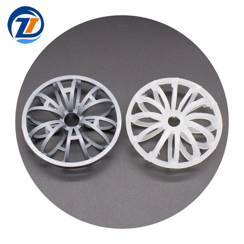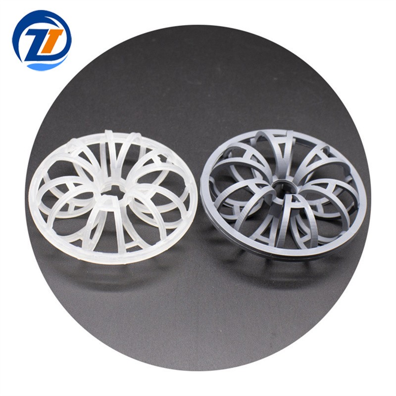 PP花環(huán)填料又稱泰勒花環(huán),是由12個小圓環(huán)按徑向排列而組成的一個大扁環(huán)體,很類似于一個螺旋形彈簧首尾相接繞成的一個圓球體。這種填料的主要特點是填料的空隙率大,不易被堵塞,還有通量大、阻力小等優(yōu)點,由于這種填料的間隙處能有較高的滯液量,可使塔內(nèi)液體停留時間較長,從而增加了氣液的接觸時間,提高了優(yōu)質(zhì)效率。
